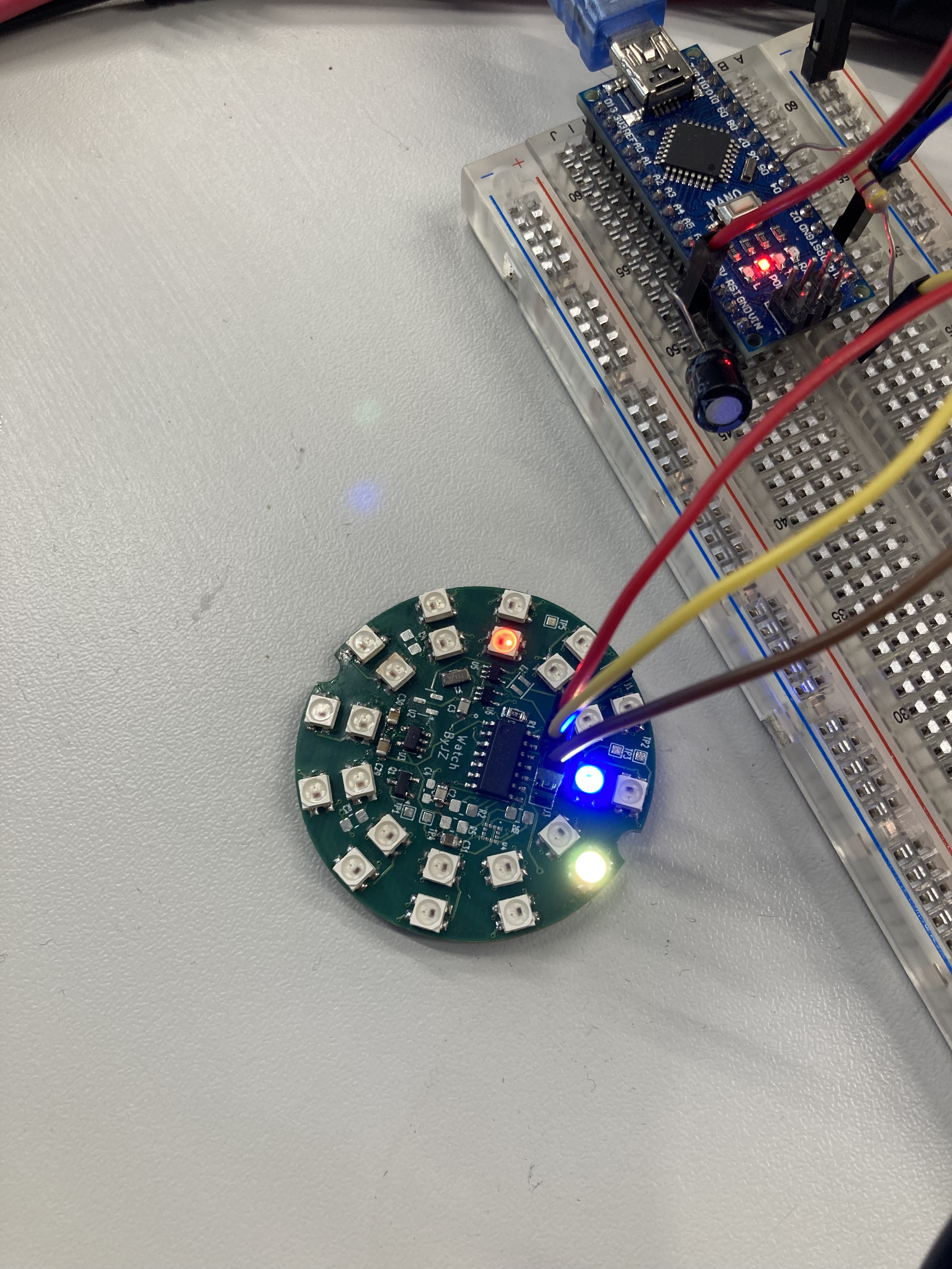 I'm making this WS2812B watch as a project for school, I'm using the attiny414 in combination with the tinyNeoPixel library. Everything is working fine hardware-wise so I'm able to make a LED-chase following the RTC using an external oscillator. The problem arises when I try to use my second data line to blink the other 12 LEDS. Then I just get 2 solid LED's on, and the first chase working. The chase works on both lines by the way, just not at the same time...