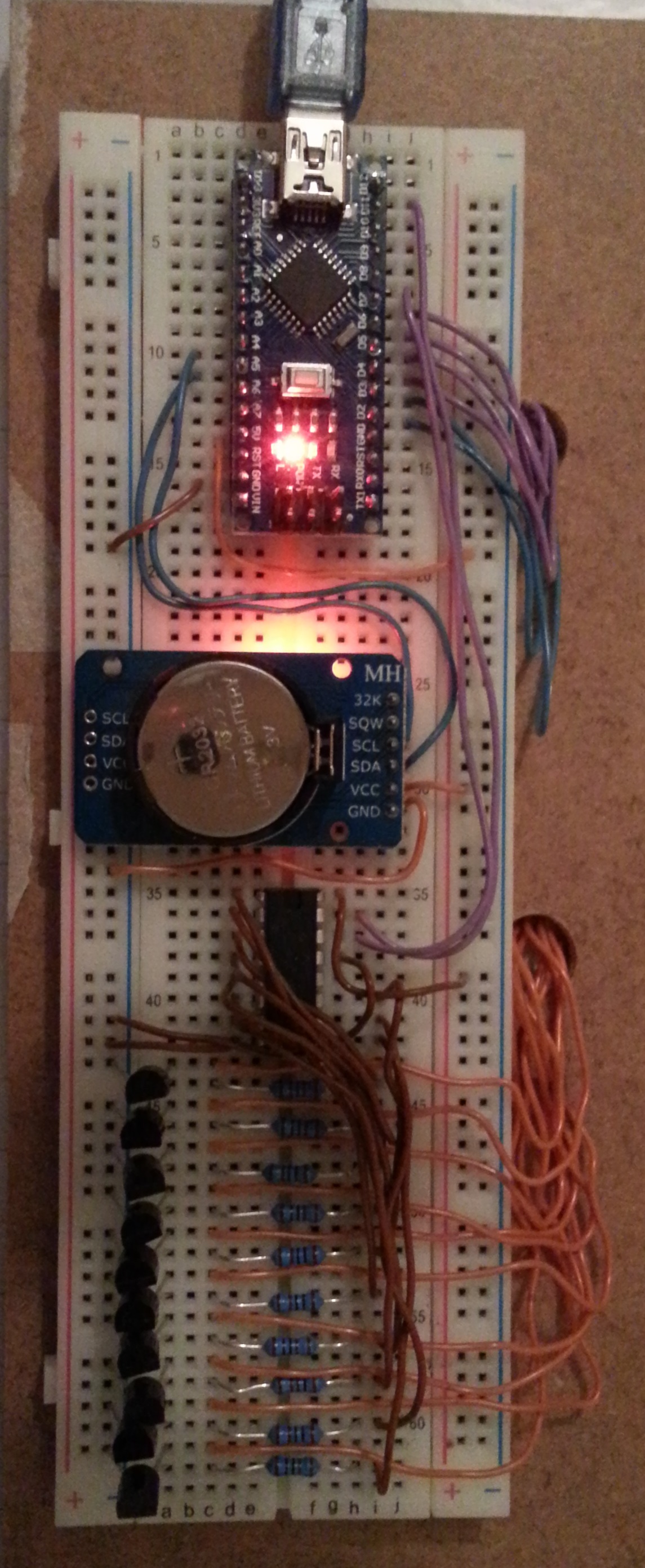 Mon projet = j'ai réalisé une matrice de 10 lignes (via IC 4017) x 12 colonnes jumelées (6 sorties du Nano) qui affiche l'heure. Il a donc fallu un RTC, en l’occurrence DS3231. Tout s'est bien passé pour la première réalisation (avec quelques tâtonnements puisque c'était ma première expérience).