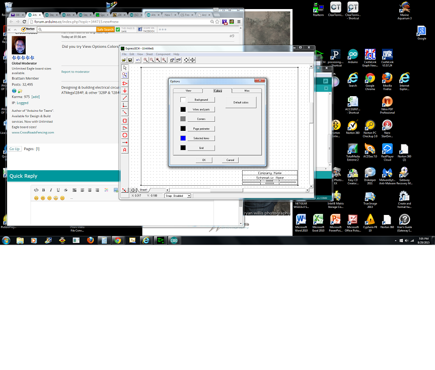 Both. Originally I THOUGHT I was using ExpressPCB and then when I went to the download page I noticed that both of them are there and since I have no intention of making PCBs, I only downloaded ExpressSCH , for making schematics, which is all I want to do. I mistakenly thought the arduino shield you linked was a SCHEMATIC but after thinking about it I realized there were no schematic symbols and it was really a PCB file. (duh, I know) So my original complaint that I couldn't get schematic colors with chip outlines in yellow, wires in green , pins in red and a black background remains a mystery. I know I saw a schematic with those colors but you can't do it with ExpressSCH and I don't think you can make schematics with ExpressPCB because I think that is for making PCBS.
