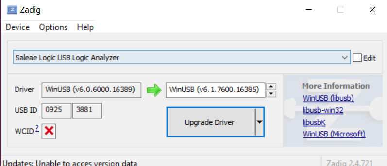 N.B ce n'est peut être pas nécessaire si tu utilises le logiciel Logic de Saleae qui amène probablement le driver qui va bien vu que ce boitier se fait passer pour un modèle 8 bites de Saleae