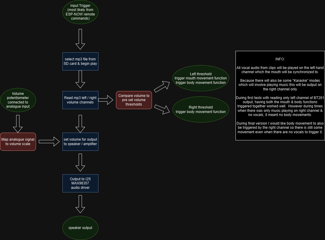 I really should have done a circuit diagram of the next part, but will do that later to upload & maybe a video of current working. I have a BT201 module playing mp3's from an SD card, this is currently using onboard controls but with software implementation I should be able to control using AT commands on serial connection (please see in my questions section why I am thinking of changing). The BT201 module has a mono speaker connections (combines stereo to mono) and also a stereo headphone jack. BOTH of these outputs function at the same time, I was able to exploit this to allow me music/signing synchronising -- I edited mp3's so that all "vocals" were on the left channel & all "music" was on the right channel. Both play through the mono speaker output so you can hear the vocals & music. However from the headphone Jack I have connected the left "vocal" output to the ESP's analogue input which I read to trigger the mouth motor.