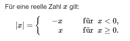 Dort steht: die Funktion: Betrag von X ist definiert für X<0 und X>= 0.