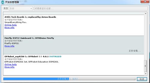 Select “FireBeetle-ESP8266” and click “Install” (I have installed). The manager will automatically download the relevant libraries.