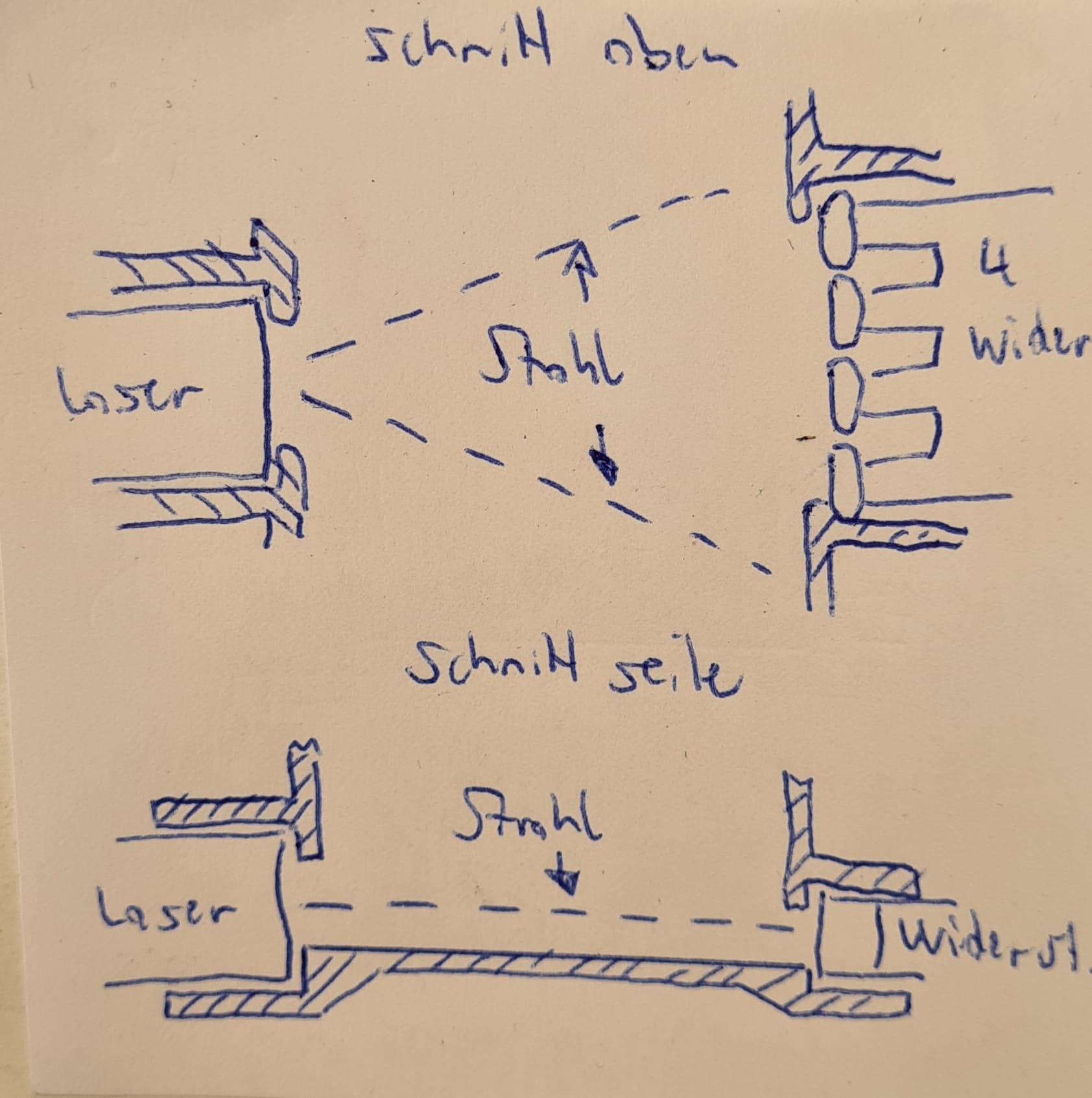 Der Linienlaser wirft sein Licht knapp über die Oberfläche des Abwurfschachtes auf 4 Fotowiderstände. Das Teil rutscht an den Dioden vorbei verdeckt dabei teilweise den Laserstrahl und verändert den Widerstand.