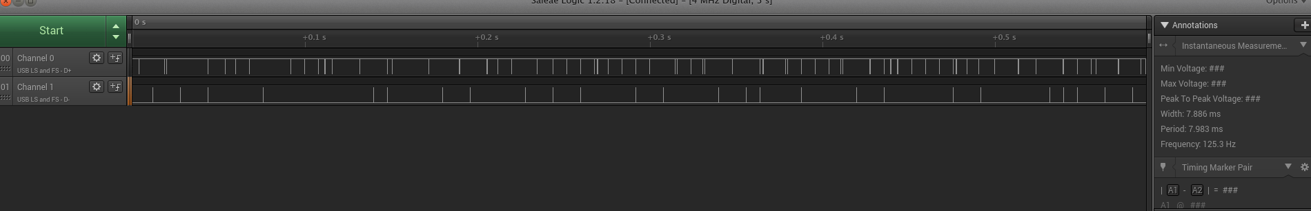 Now I can read the Data lines on my keyboard via the Logic Analzyer alone at 4MHz and parse out the information I need. The end goal is to have the Arduino parse this differential signaling and pass it to other devices. I want to use the logic analyzer for now to make sure the Arduino is getting the correct information needed to replicate.