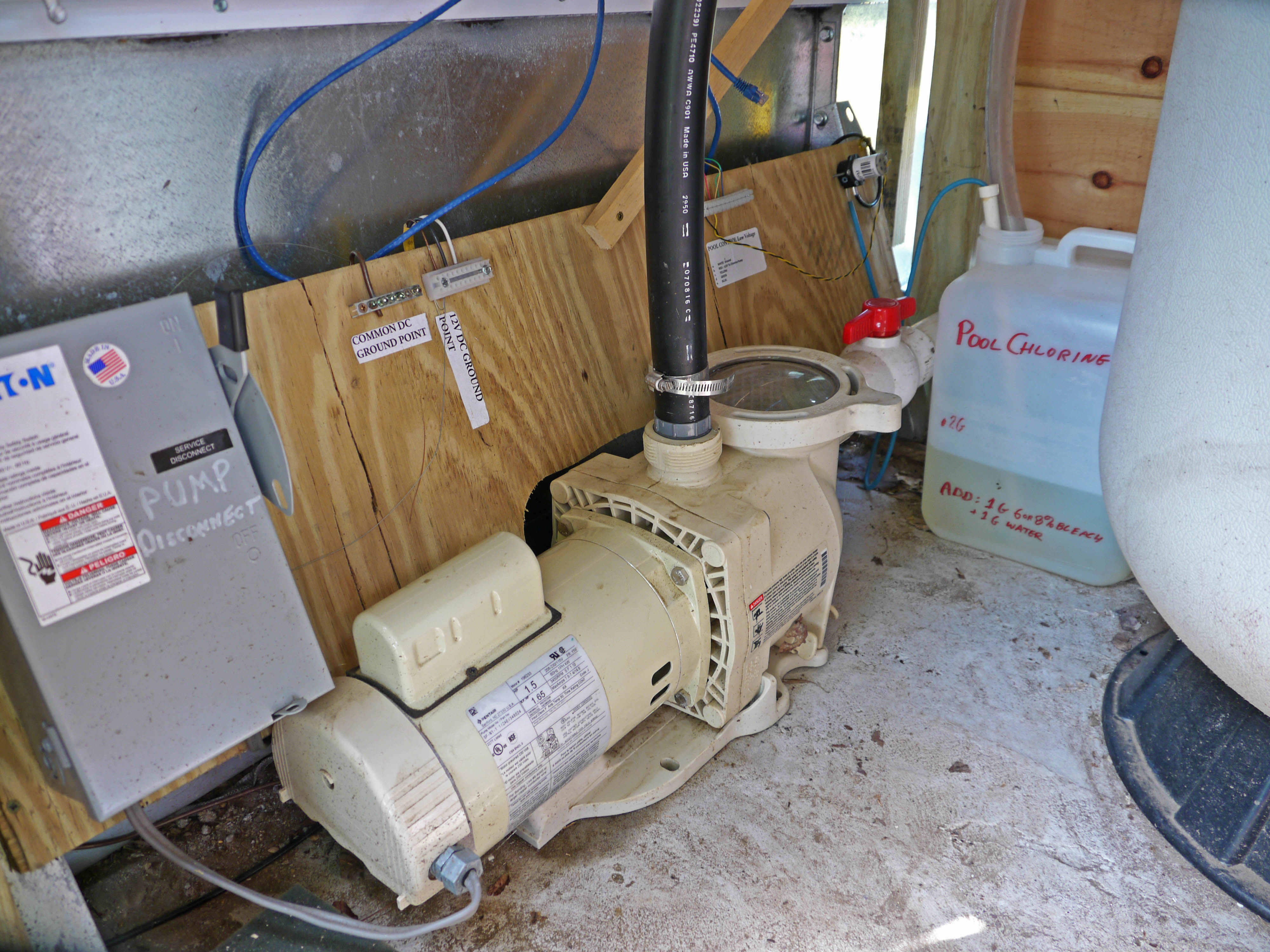 I also do the Chlorine dosage twice a day. Great for when you go away for a while.. Here's my pump and on the far upper right the small peristaltic pump for Chlorine. Keeps the chlorine at 3 to 5 ppm and never smells like chlorine when swimming.