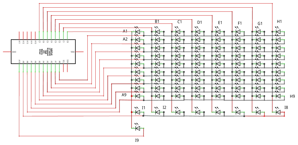 En el diagrama de arriba las filas/columnas (ánodos/Cátodos) están asignadas a los pines C0 al C7 y los A0 al A9 (El A10 aperece ocupado, pero sobra.)