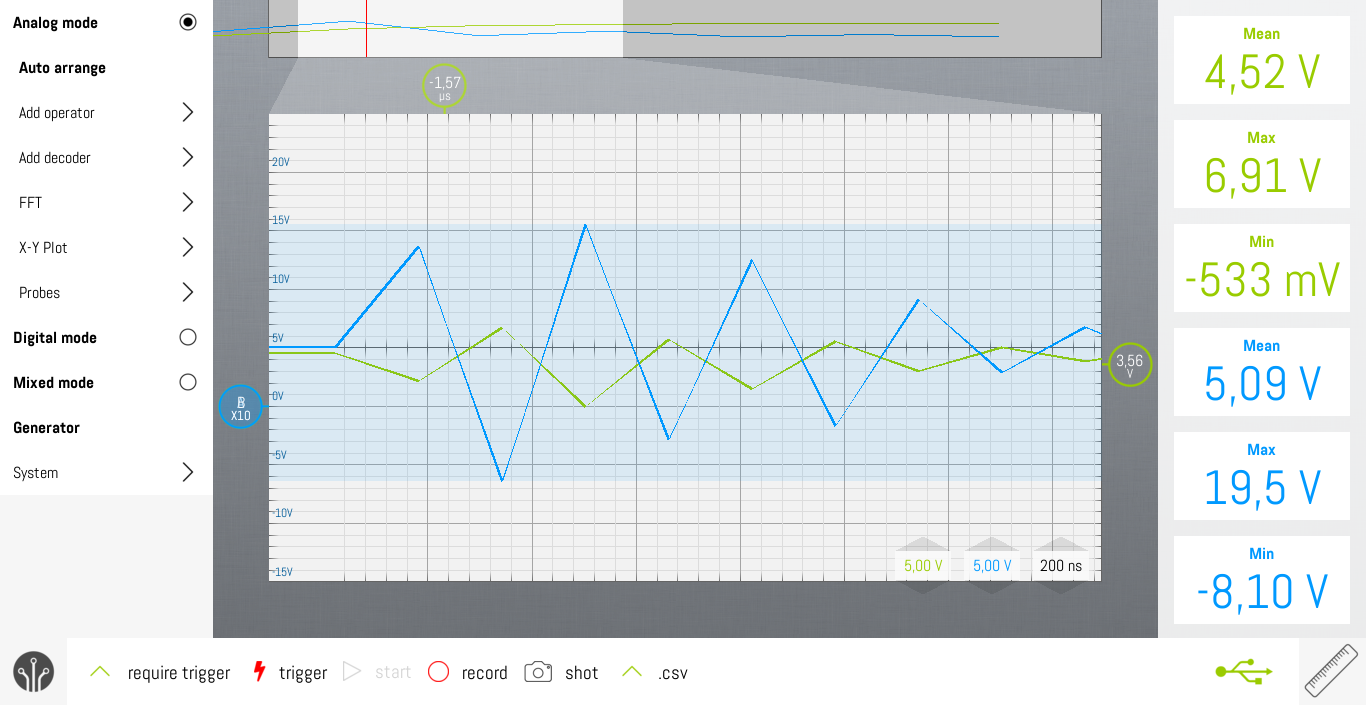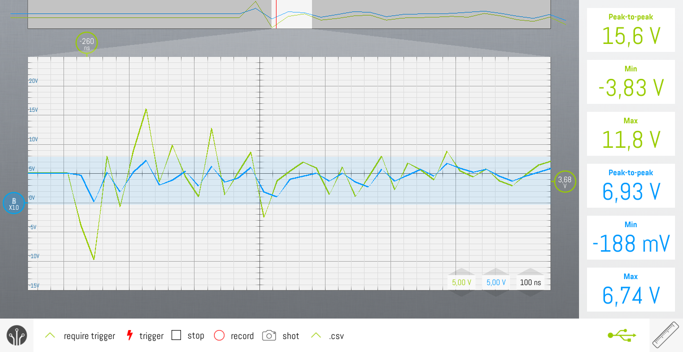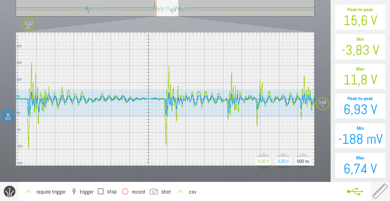 Nun war zu sehen, das sich die Spannungsspitzen am Eingang des MCP fast komplett erledigt haben. Es gab nur noch vereinzelt Überschreitungen über die 5V-Grenze, da die Diode abhängig von den Spannungsspitzen ggf. nicht schnell genug reagiert.