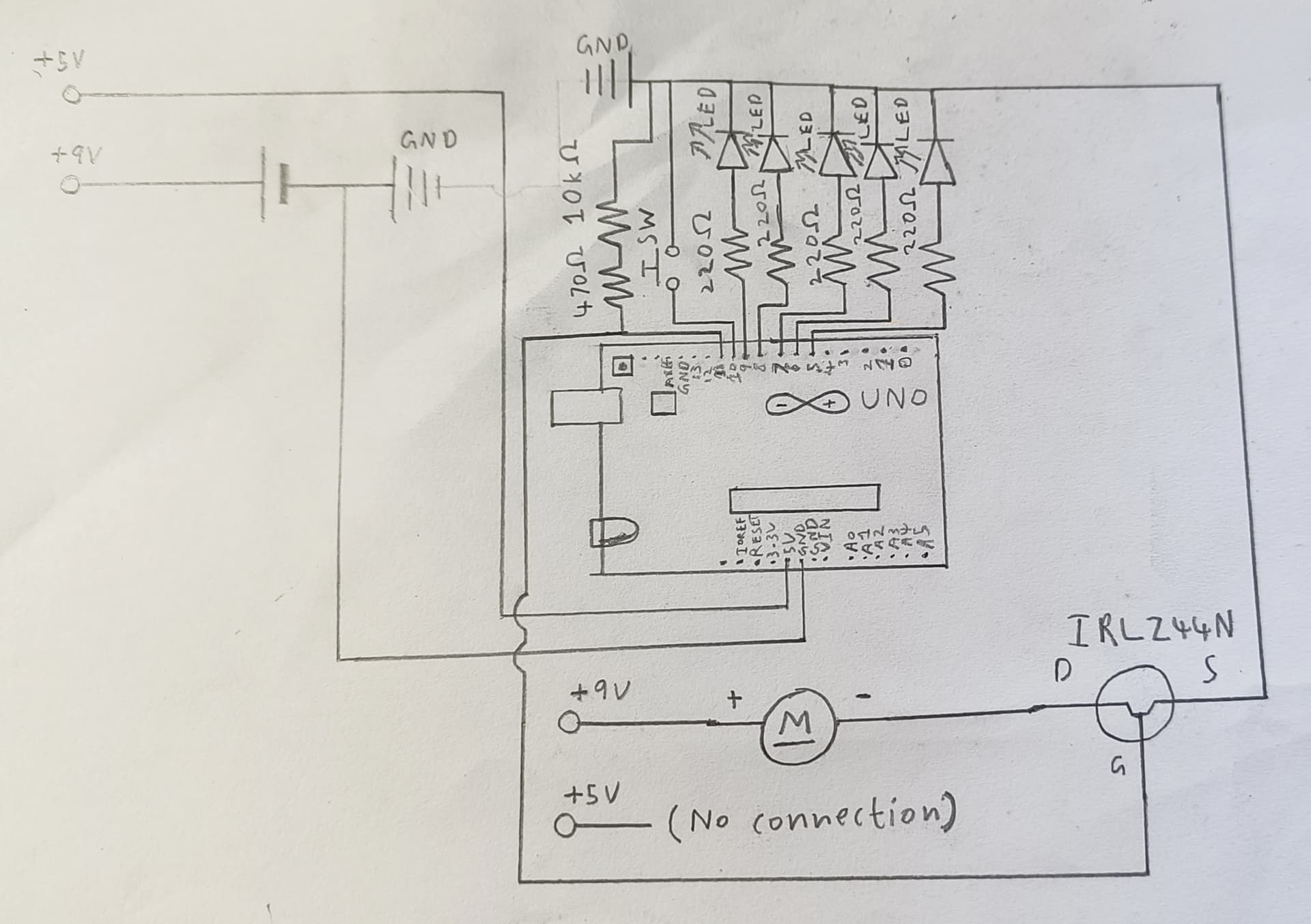 Below, I have provided the code and circuit to make your very own Arduino table fan with different speed levels. You have 5 speed levels, and the speed level is indicated by the number of LEDs that are lit up. If none are lit up, that means the table fan is turned off. When it is turned off, you can press or long-press the button to turn it on. If turned on, you can short-press the button to cycle through the different speed levels or long-press to turn it off. The five LEDs, LED-1, LED-2, LED-3, LED-4, and LED-5, are connected to pins 9, 8, 7, 6, and 5, respectively. The button is connected to pin 10, and for the motor, connect it up with a MOSFET (recommended) for proper control. Additionally, please note that the MOSFET here is an IRLZ44N, which is an N-channel MOSFET that you can use to drive a motor with an Arduino. Connect the MOSFET’s gate pin to pin 11, and ensure the motor has a good power supply. Make sure you properly ground all the components, and also make sure that the motor’s external power supply shares a common ground with the rest of the circuit to work. However, do not do the same with the voltages, as this can cause a short circuit. For button logic, any press shorter than 50 milliseconds is considered noise. A short press will range from 50 milliseconds to 500 milliseconds, and anything above 500 milliseconds is regarded as a long press. Before proceeding, please note that I have only simulated it online as I’m low on parts. If you are planning to build this, test it online first, and be careful not to damage any components when building the contraption IRL.