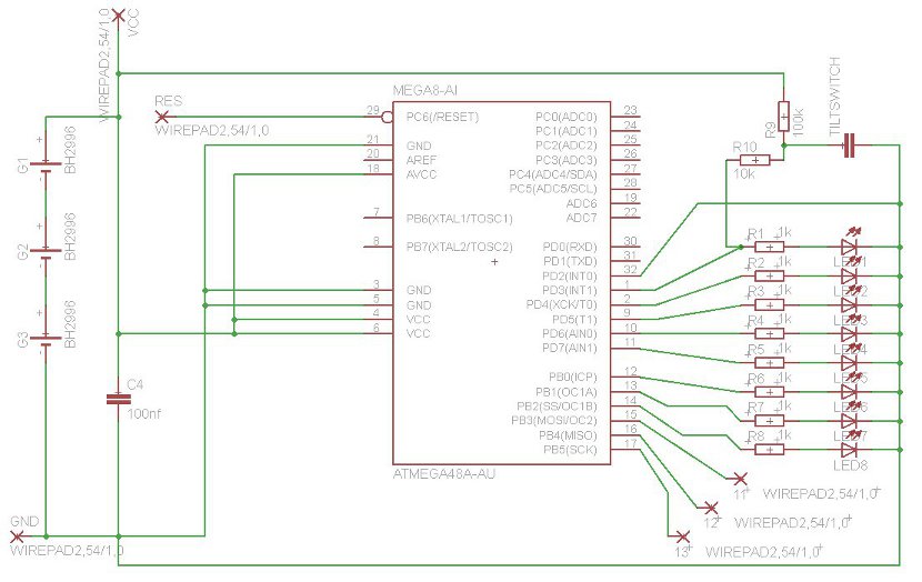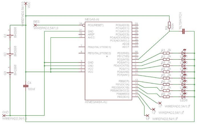 Supply voltage doesn't change visibly when the tilt switch opens and closes. I'm using a hand soldered surface mounted chip so, although everything seems to be connected with no shorts, it's not impossible that the chip got hotter than it should. Would that cause this behaviour? I understand that the fuses in the boards.txt only get set if a bootloader is used, might there be something in the default behaviour of the atmega48 that is causing this behaviour and I need to override? (If so how? (When I first powered up the chip, before managing to upload the sketch, all the LEDs flicked in the same way they do when DP2 is +ve) Is my wiring just wrong? I have defined DP2 as input in my sketch
