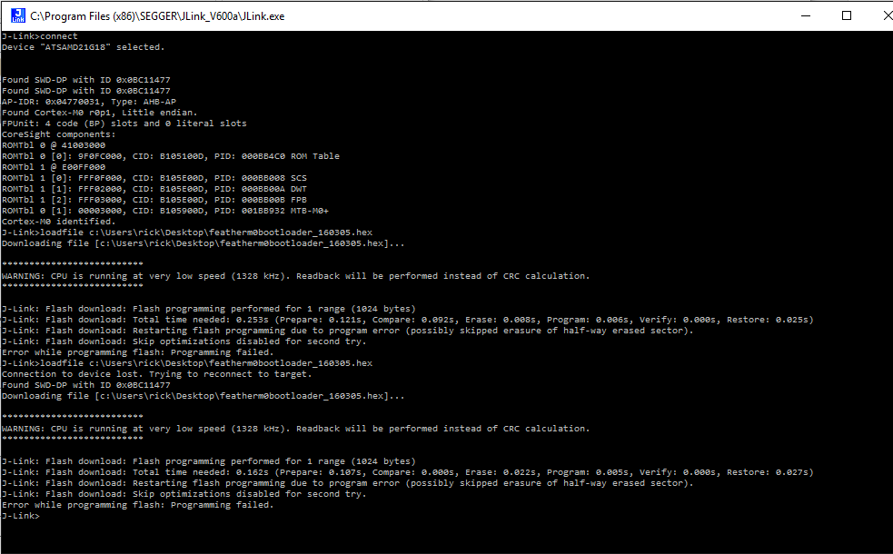 @AloyseTech I've been tearing my hair out trying to program the Adafruit Feather M0 bootloader with the Segger JLink............