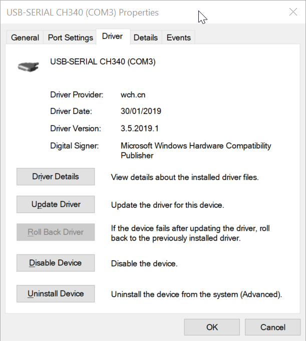 My Windows version is 10 Pro version 1809. My CH340 driver is dated 08.08.2014. version 3.4.2014.8 Provider wch.ch and is signed by Microsoft Windows Hardware Compatibility Publisher. Everything seems to work with CH340 devices.