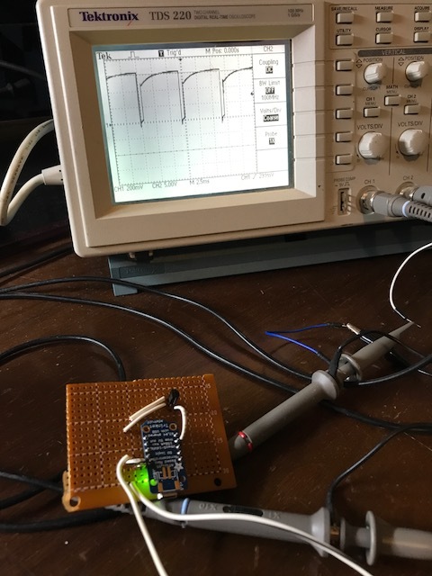The two connections have about 6 volts DC across them, with the middle screw (#2) being the ground/negative and the right screw (#3) being the positive. Shorting the two terminals together results in about 60 mA of current flowing, so there is a resistor in series that prevents a short circuit when the terminals are shorted together. Both the emitter and the receiver are powered by the voltage from these screws, and the output of the receiver is sent back to the head unit over these same power leads by shunting the leads together to create a pulse train. The oscilloscope work reveals the timing that signals the garage door opener that the beam is not obstructed. The absence of these pulses causes the opener to be unwilling to close the door, and it reverses to the open position automatically if the pulse train is lost while the door is closing.