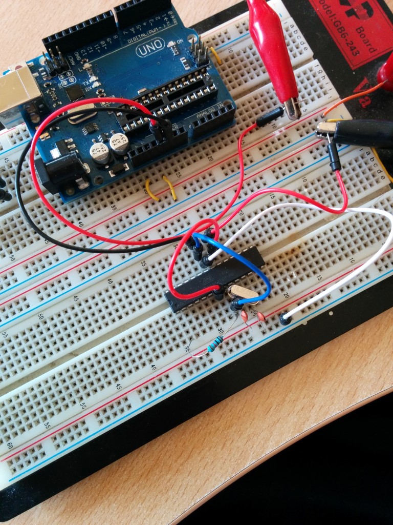 I started to study the power consumption of the ATMEGA328P itself, so I connected it on a breadboard with the minimal configuration as shown in the attached picture