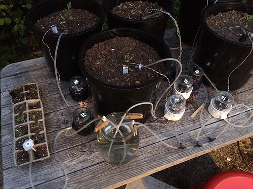 My newest effort was to send 250kHz into the soil and measure how much got through to the other wire. That seems to work, but I never finished it. Today I check the weight of the flower pot and make a guess if it needs water or if it can wait another week.