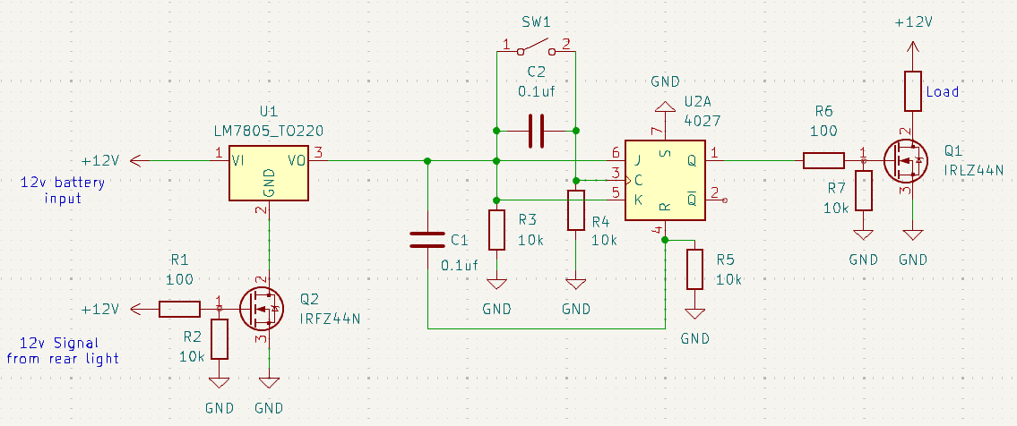 The main aim is to use a 12v switched live from the tail light of a motorbike to trigger the first mosfet so there is minimal effect to this light.