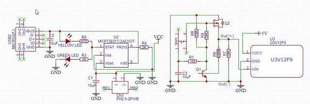 Below is an image of my current schematic. It may be a noob question but I'm completely unsure about how I'm suppose to connect the positive terminal of the JST battery connector to the soft latch circuit. The idea is that the battery would be enough to trigger the circuit and then that would run to the U3V12F9 boost converter which would then go to on to power the rest of the circuit with 5V. I'm not sure if I'm connecting the positive and negative outputs of the circuit to the converter correctly either.