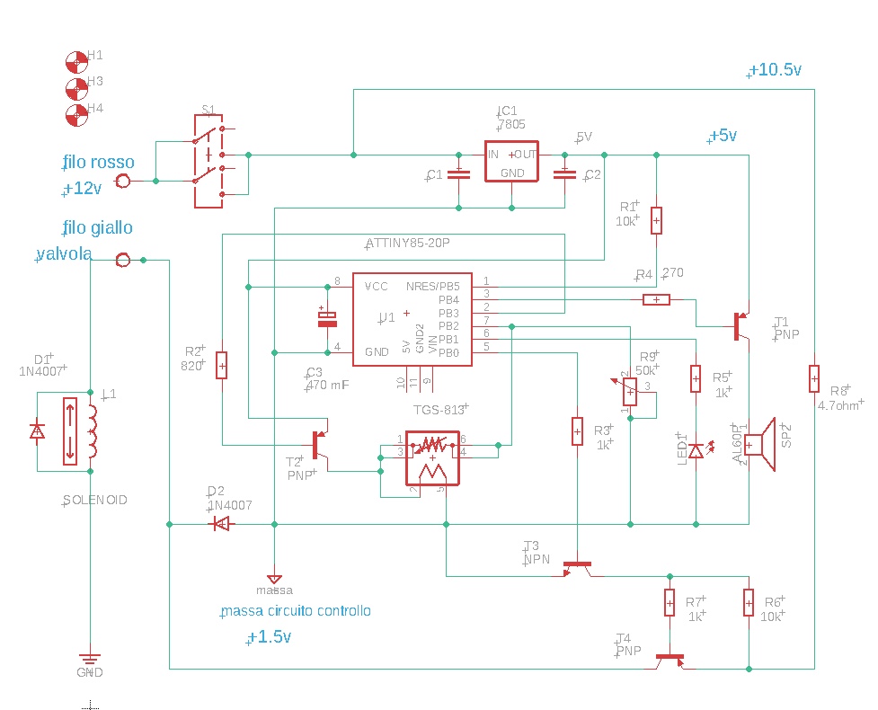 Il sistema si accende, scalda il sensore, se tutto ok accende la valvola, corrente assorbita 180 mA, tensione almeno 7/8 volt (5volt all'uscita del regolatore)