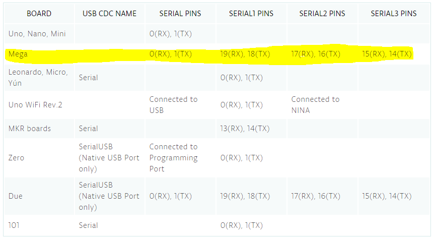 Not all pins on the Mega and Mega 2560 support change interrupts, so only the following can be used for RX: 10, 11, 12, 13, 14, 15, 50, 51, 52, 53, A8 (62), A9 (63), A10 (64), A11 (65), A12 (66), A13 (67), A14 (68), A15 (69).