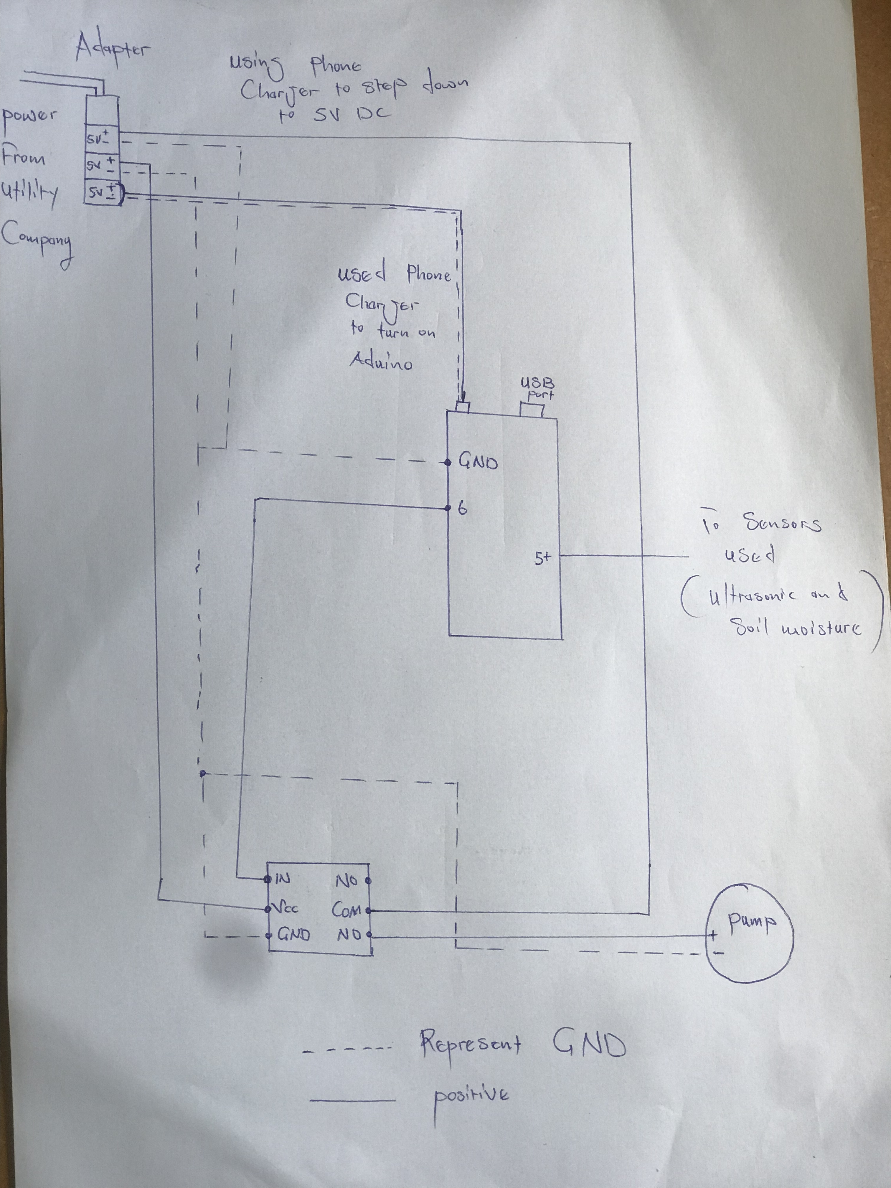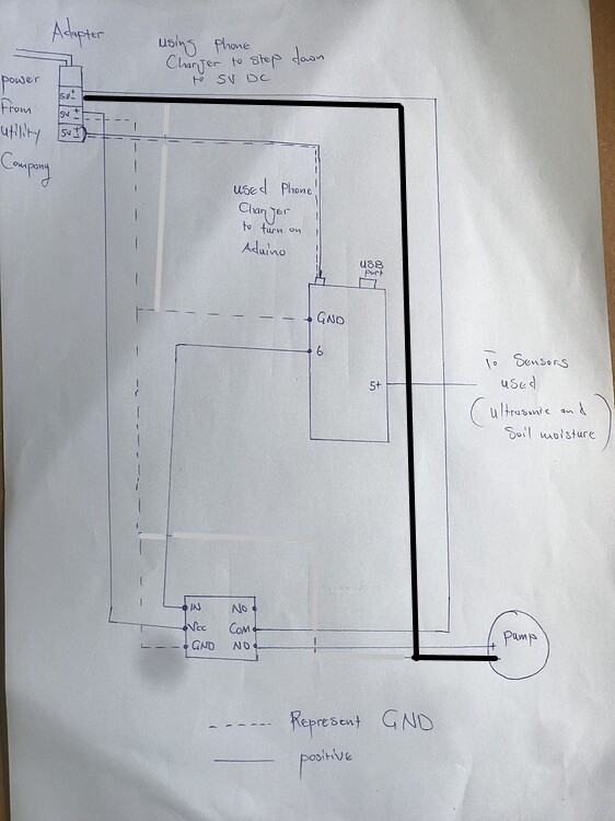 I’m currently having problems with my laptop, but I have shown drawn a schematic using a pen hope connection are visible. A 5V 12V One 1 Channel Relay Module Board Shield with optocoupler Support High and Low Level Trigger is used as a switch for a pump, I’m currently stepping down AC using 5v 2.0 A phone charge to turn on arduino and 2 other identical phone chargers one is used as power source for relay and another one is connected to common port of relay and pump positive terminal is connected to normally open terminal. The ground of all phone charges is connected to common arduino ground.
