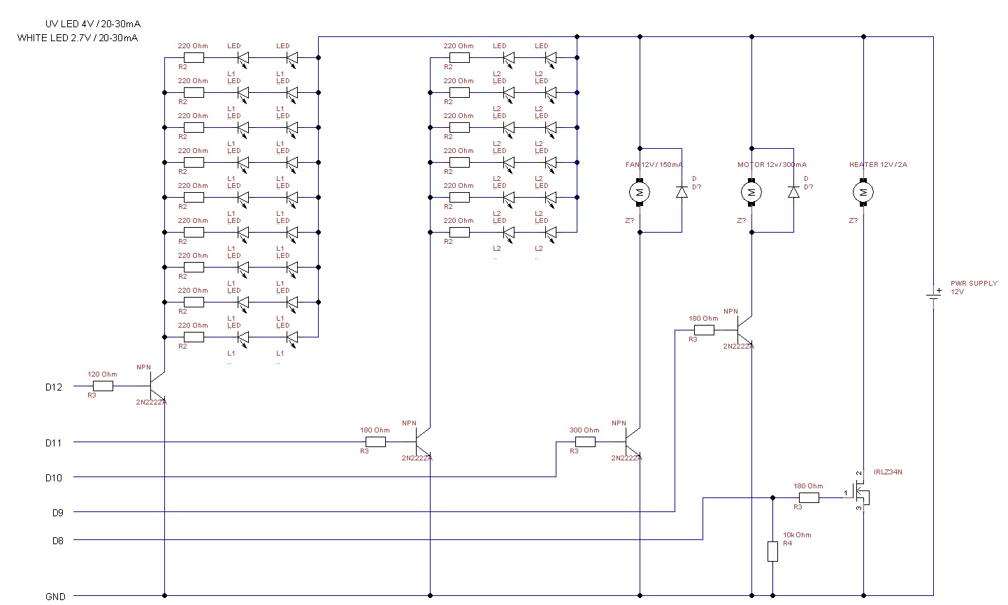 The last "motor" is a heater sticker. It draws approx. 2A so I replaced the 2N2222A with an IRLZ34N Mosfet.