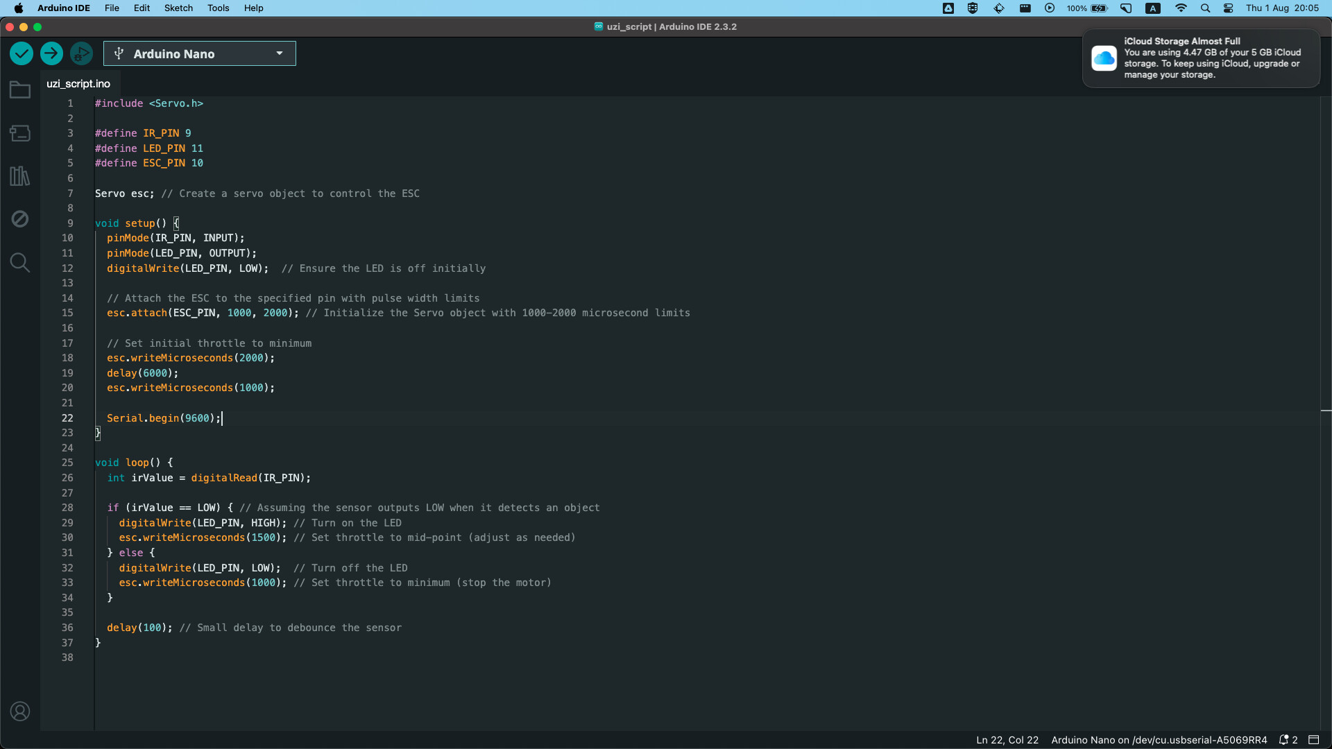 I'm trying to get my Arduino Nano (ATmega328P - old bootloader) to control a Turnigy Plush ESC (Electronic Speed Controller) for an RC plane brushless motor.