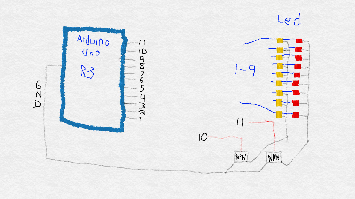 OK so i am kinda new at this. my question is when I hook up both npn transisters both rows of led do the same thing. But my code is wrote to control both rows of led seperate.. when only one npn is hooked to arduino the row of led works like it is suspose to. I attached a drawing of my circuit minus the resistors...