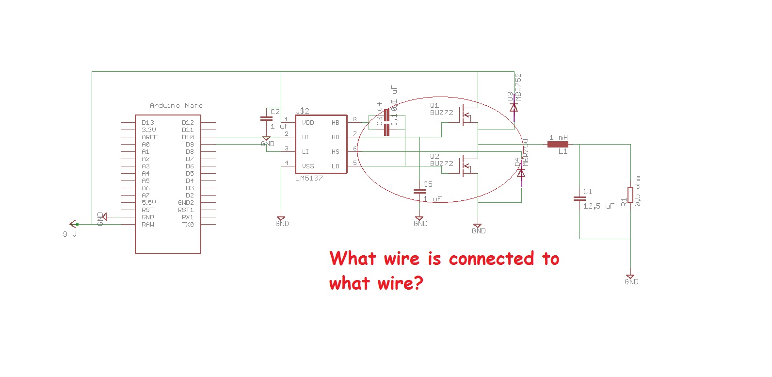 I have two PWM output, pin10 and pin9, controlling respectively the high and low input of the mosfet driver. I never need both at the same time, and because of the initialization, the program goes directly in buck mode (PWM output at pin 10). To switch between using one pin or the other, I programmed a switch using interrupt on pins D2 and D3. If pin3 contacts ground, the device should go in boostmode, meaning I get a PWM out of pin 9 in the bottom input of the mosfet driver. If pin2 contacts the ground, then the buckmode is set, and there is a PWM output at pin 10 aand none at pin 9.