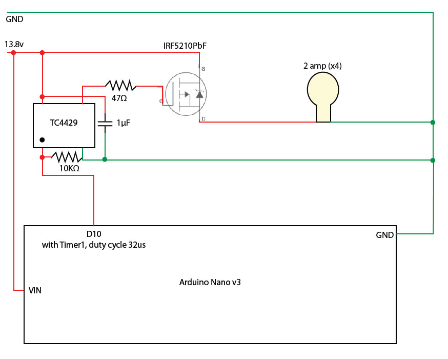 The circuit is now set up as in the attached diagram. However something is not quite right. For testing, I am running the circuit on 11.9 volts. When D10 is high the output from the TC4429 reads 11.65 volts on my multimeter and 11.9 when D10 is low. Obviously, that is not enough to turn the IRF5210 on.