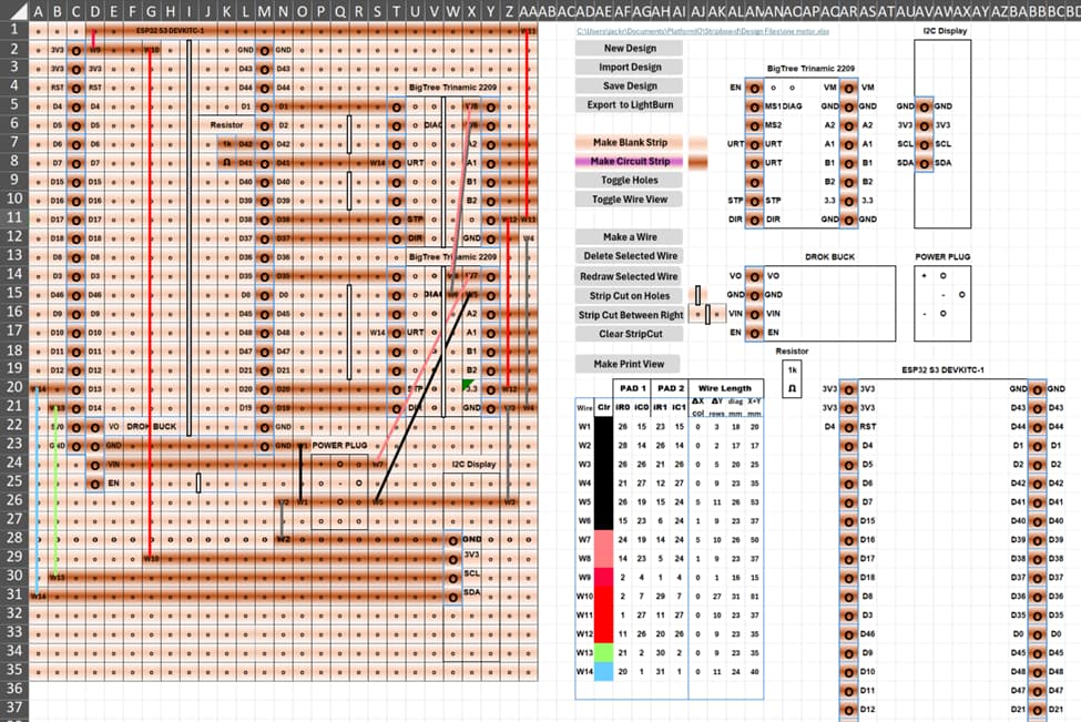 I wanted a design tool to aid in this process, and I used the macro language embedded in Microsoft Excel for that. Picture 1 shows the first sheet of the macro-enabled Excel tool, for a project having an ESP32 S3 DevKitC-1, two BigTree Trinamic 2209 driver boards for stepper motors, a BROK buck converter, and a small I2C display showing the IP address of the user interface for the project.