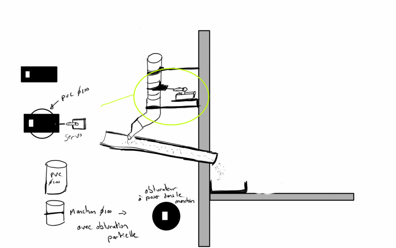 Dans le manchon diamètre 100 j'ai fabriquer un obturateur avec un PVC découper et mis à plat au décapeur thermique et dessus une lame pvc qui glisse , quand les deux fenêtres coïncident les croquettes tombes .