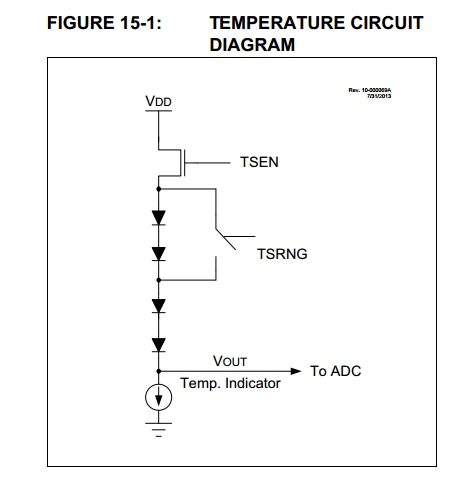 The datasheet doesn't say, but I'm pretty sure the temperature sensor is just a few diodes in series with a current source, like this diagram from a PIC datasheet: