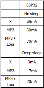The ESP32 himself in deep sleep mode should be 8 µA, and I got 3 mA. I’m far away from the expectation with the ESP32 in the first place, and I want to know why because maybe it can reduce the consumption with the MP3 and the Lora.