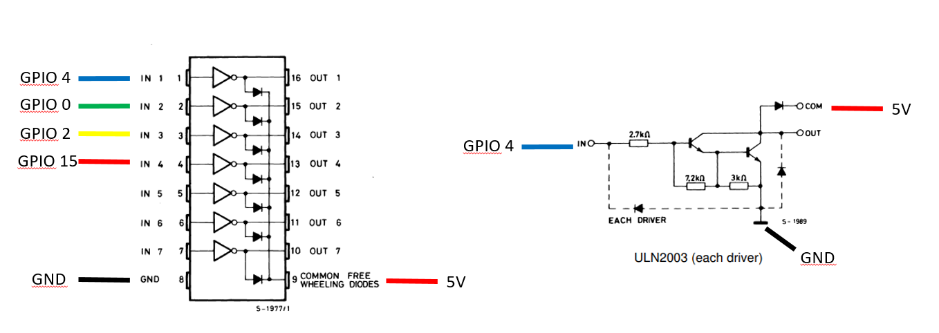 After I upload a simple program to drive the stepper using GPIO 4, 0, 2, and 15, I see the board's built-in LEDs blinking as I'd expect since those are driven by the same pins I am connecting to the ULN2003 module.