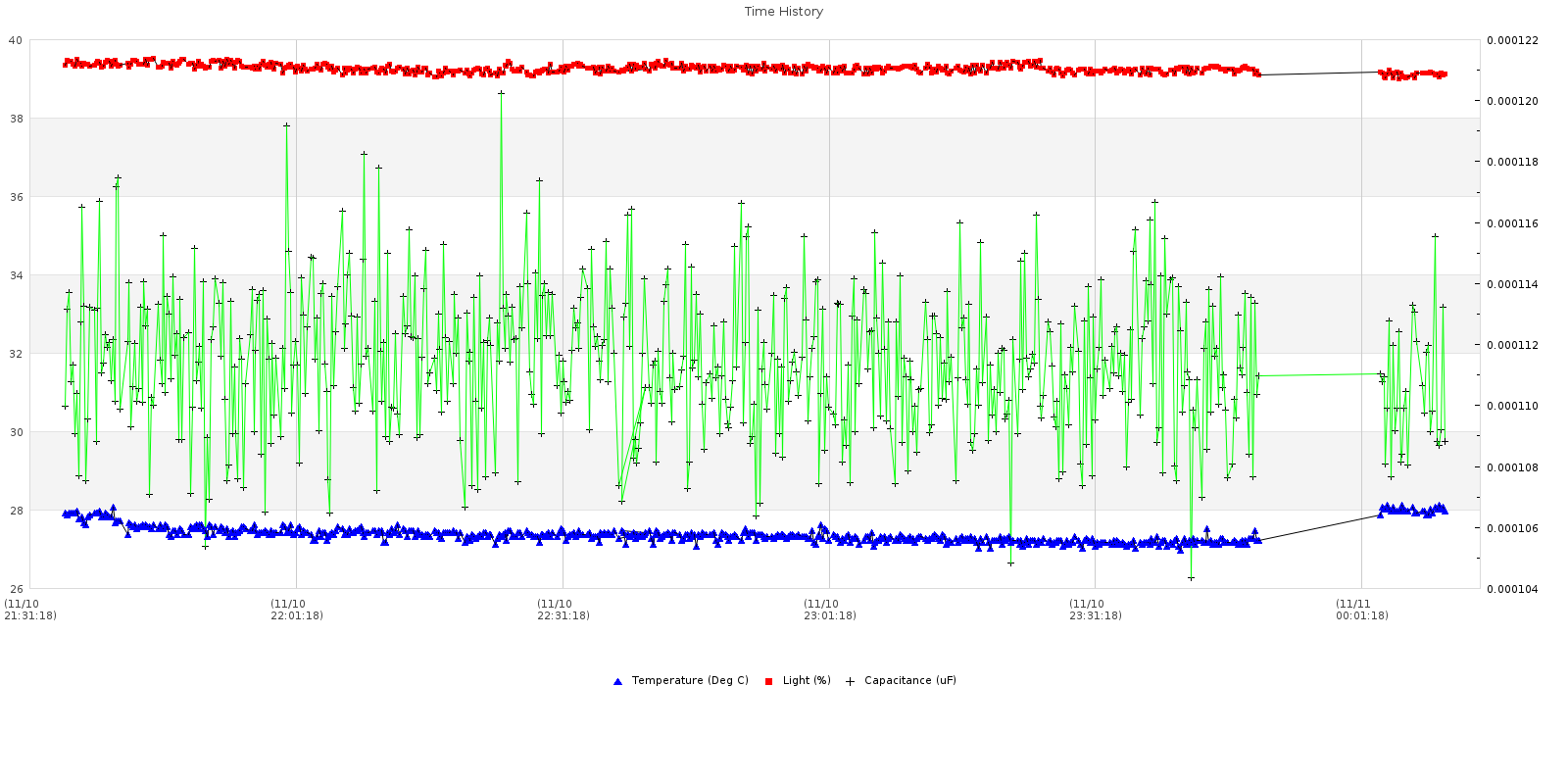 Sample: 14, Time: 0, Capacitance: 0.000000000105852, Temperature: 28.231, Light: 69.05%