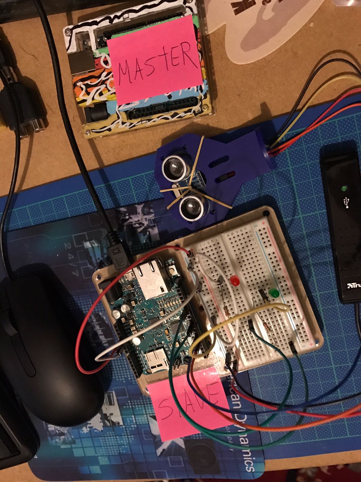 voilà ou j'en suis j'ai monté un hc-sr04 (le seul que j'ai sous la main) sur la leo, maintenant elle doit envoyer son signal sur la uno (master).