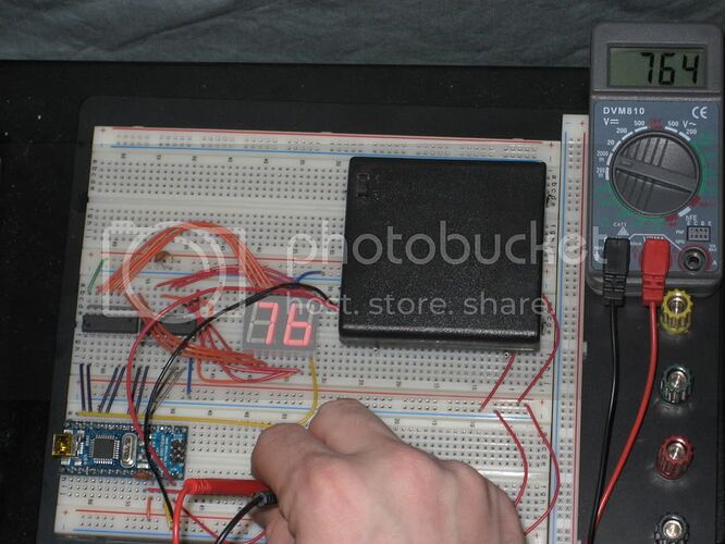For my first Arduino based project I decided to take the output of am LM34 Fahrenheit temperature sensor (could be adapted for the LM35 easily) and have it read out on a 2 digit 7 segment display. You can see my horrid code and a flash-annihiliated picture below. The jumper wires were precut standard lengths, so it isn't pretty, but it works. The ICs are 74LS48 7-segment display drivers. They convert a BCD number into the 7 signals required to make the equivalent decimal number. Hope someone finds this useful.