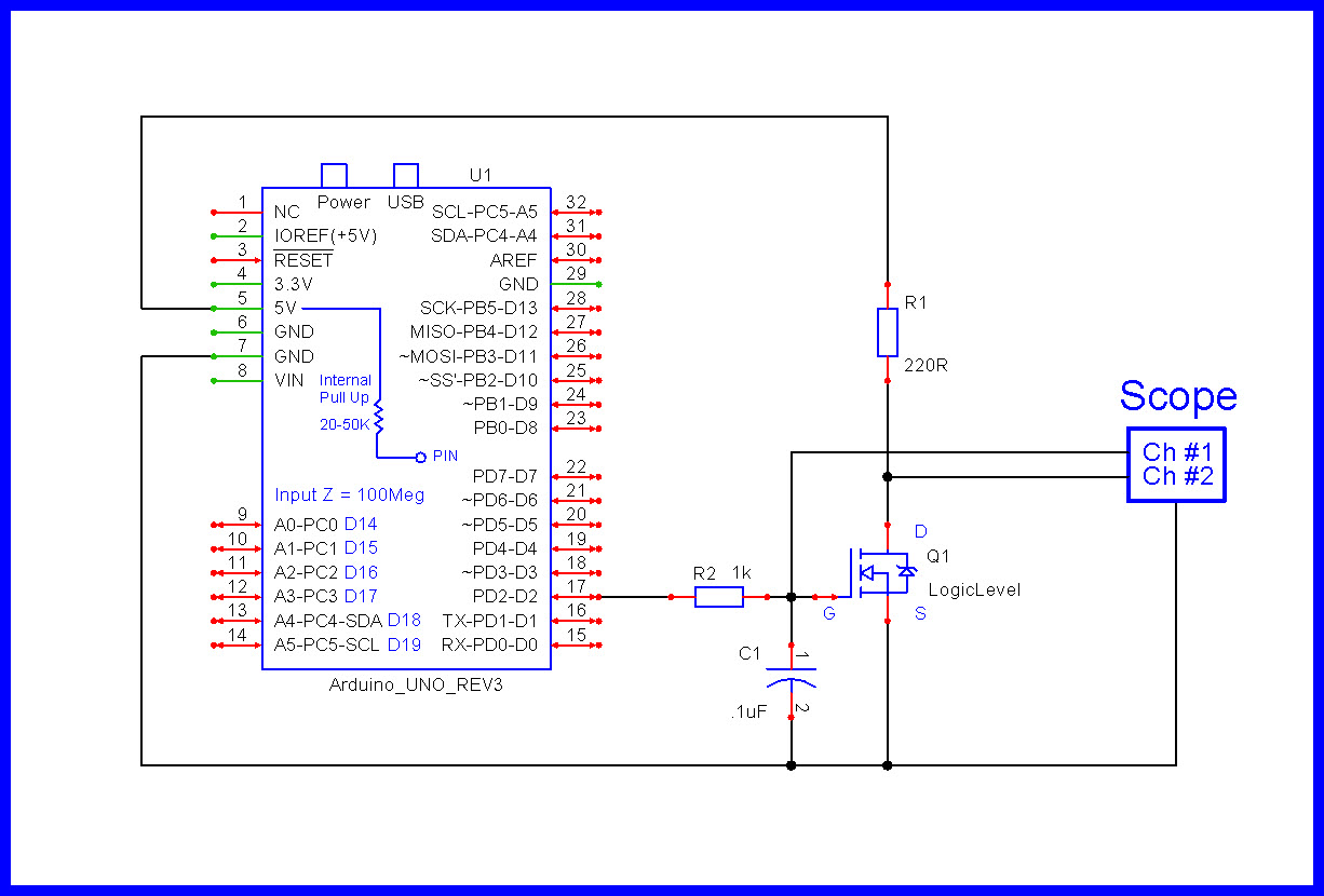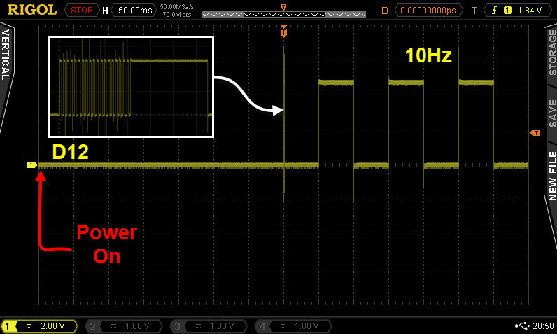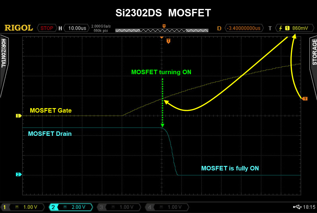 You then use the Cursors to measure the time difference between the bottom of the first spike, and the bottom of the second spike.