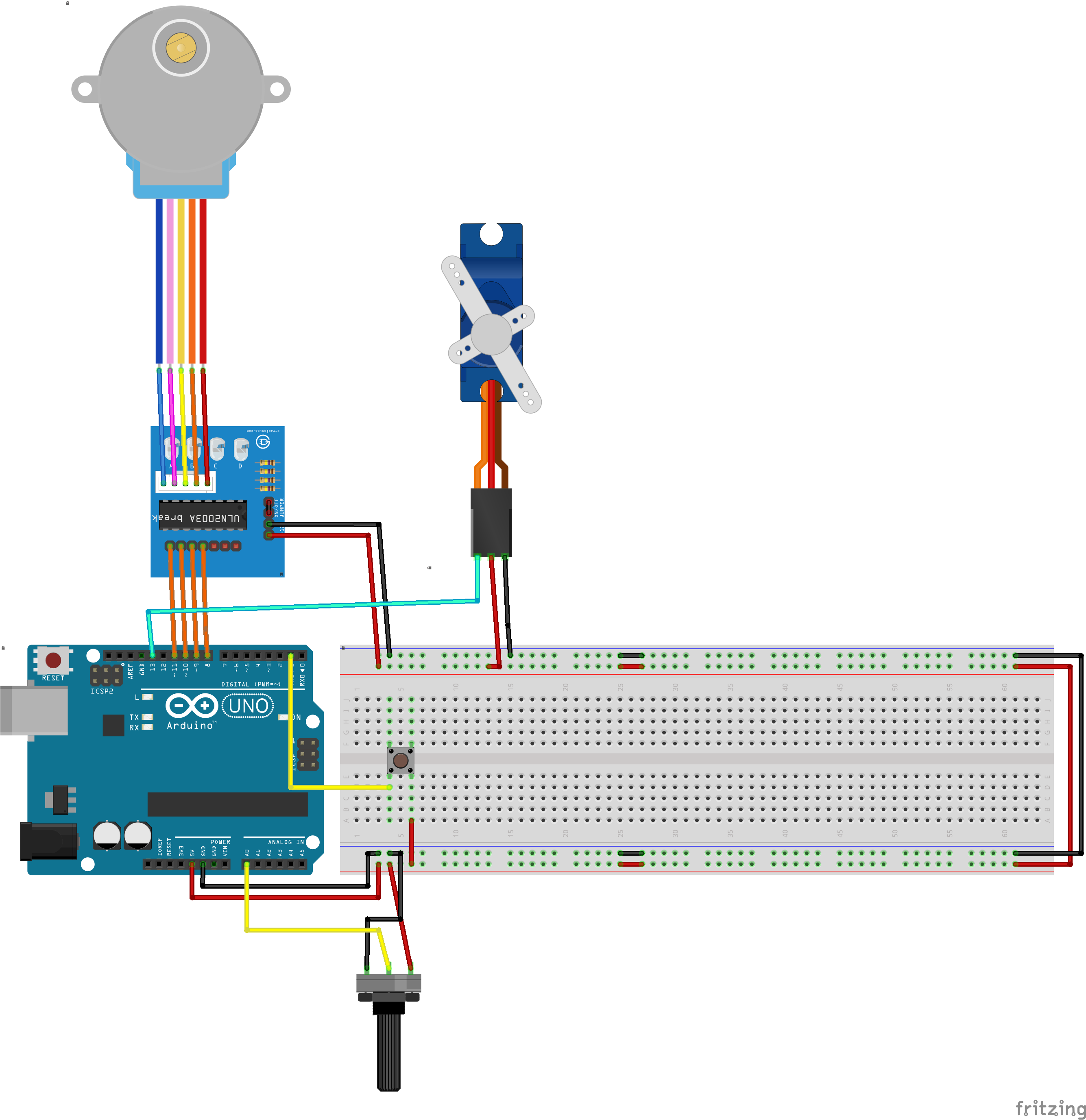 I'm working on a project where I need to controll a stepper motor with a potentiometer. At the same time I need a servo to open a hatch when i press on a button. The problem i now have is that my code behaves strangely. Sometimes the stepper motor turns in a random direction and doesn't respond to input from a potentiometer. The servo also makes weird movements and only sometimes responds to inputs from the button. Does anyone know the reason of this strange behaviour? When I dont include the part of the stepper motor the servo works perfectly.
