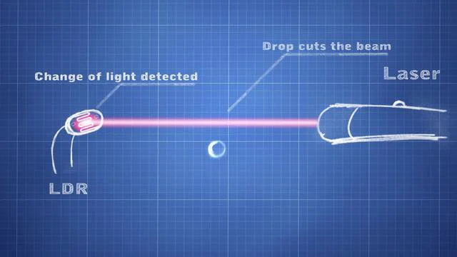 We decided to rig up a sensor that would detect the exact moment when the drop created the splash. We pointed a laser light at a Light Dependent Resistor so that it would read its maximum value. As soon as the drop would cut the beam, the LDR would read a different value and that would trigger the picture. But the problem is, it happens at such a high speed, the camera’s shutter didn’t have time to operate. To fix that we did the experiment in a dark room, and set the camera in “bulb” mode, which means the shutter opens as long as the button is pressed. Then it was a case of rigging it up to the flashes and we had it.