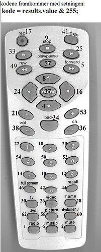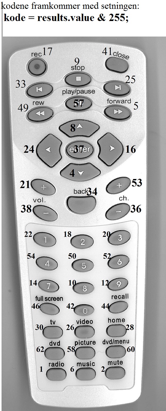 as each button sends a loooong code, add : byte keycode=results.value & 255; // mask to 8 bit