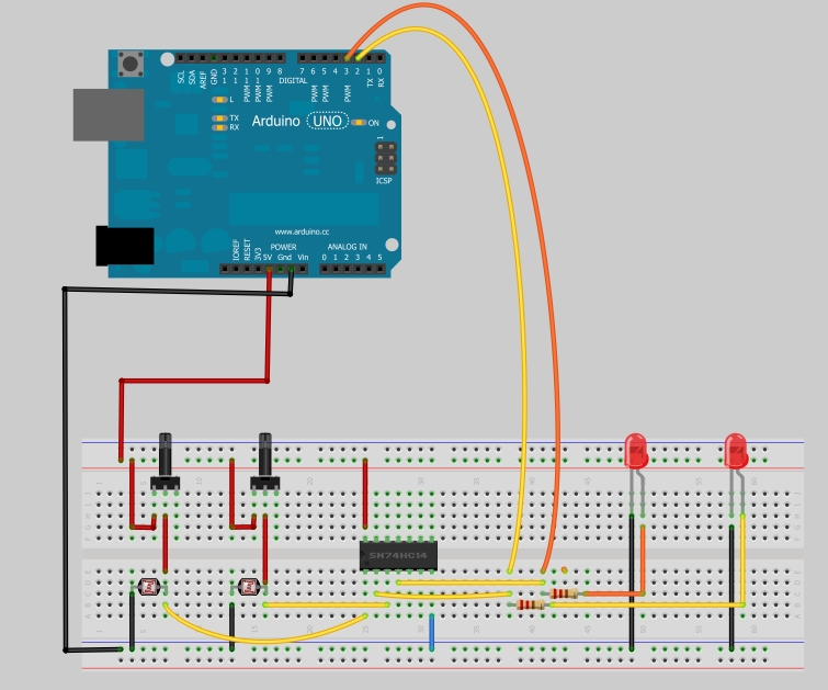 Das Gatter hatte ich empfohlen als es ohne nicht lief und er schon LDRs und auch glaube ich Fototransistoren probiert hat.
