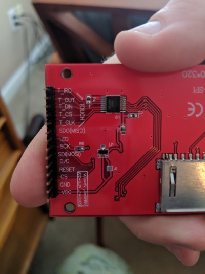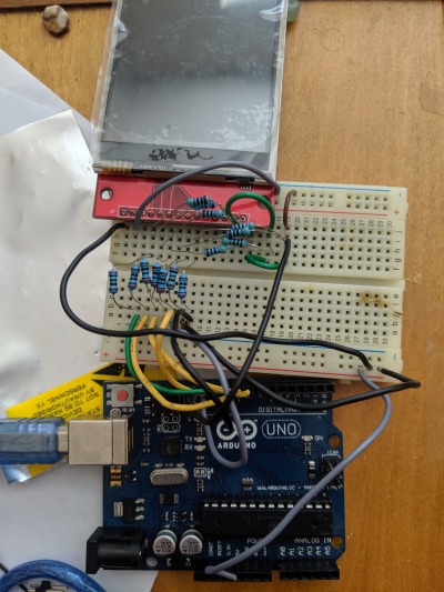 Each except for VCC, GND and LED has a 470 ohm resistor (which I assumed to be a pulldown resistor, as it was a generic 1k in the pinout I followed) between the TFT and the Arduino pin.
