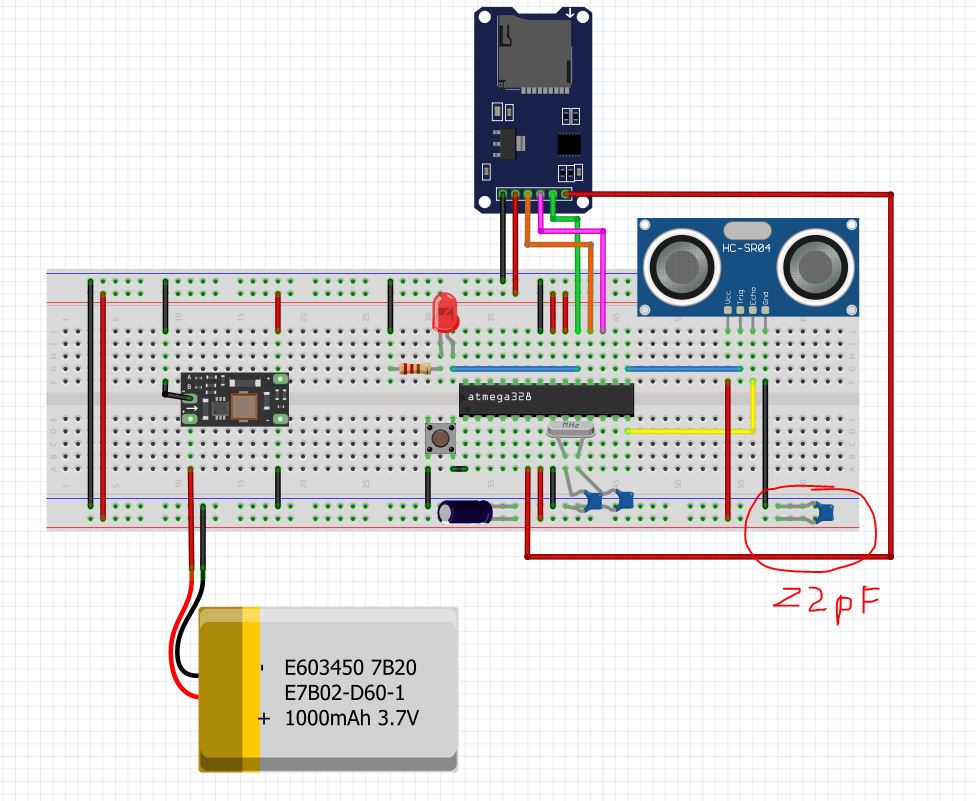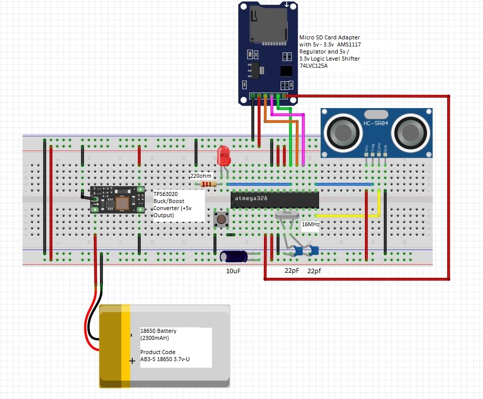 Having got the HC-SR04 measuring well and logging to the SD card connected to an Uno powered via USB from my laptop I migrated it all over on to a bare bones arduino on a breadboard which again worked as intended when the circuit was powered via the 5v and GND pins of the Uno board.