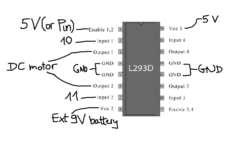 It's a 12V DC motor (0.32A), but works just fine with 9V (6xAA). It's wired up like this on a breadboard (see pic), I have common grounds everywhere (Arduino, 9V battery, L293D all common grounds). And the simple code I'm using for this: