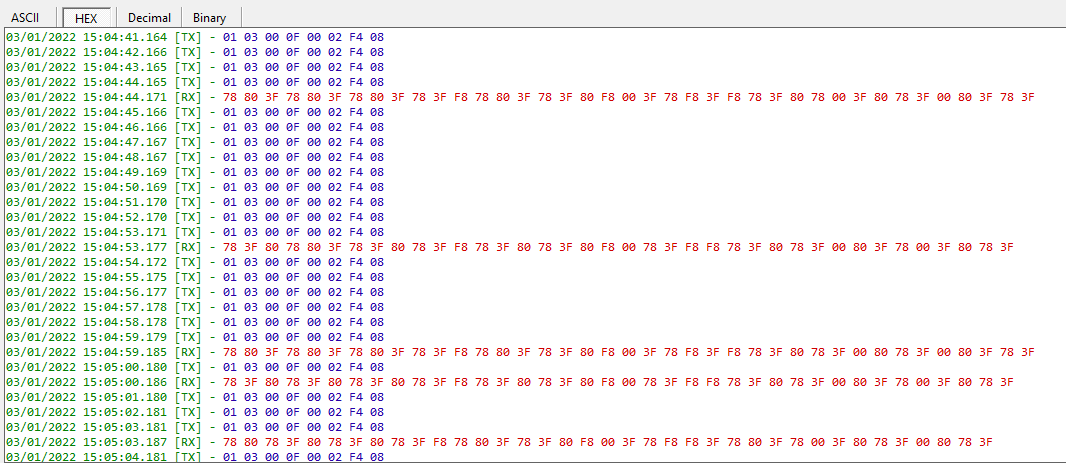 uint8_t command[8] = {0x01,0x03,0x00,0x0F,0x00,0x02,0xF4,0x08};