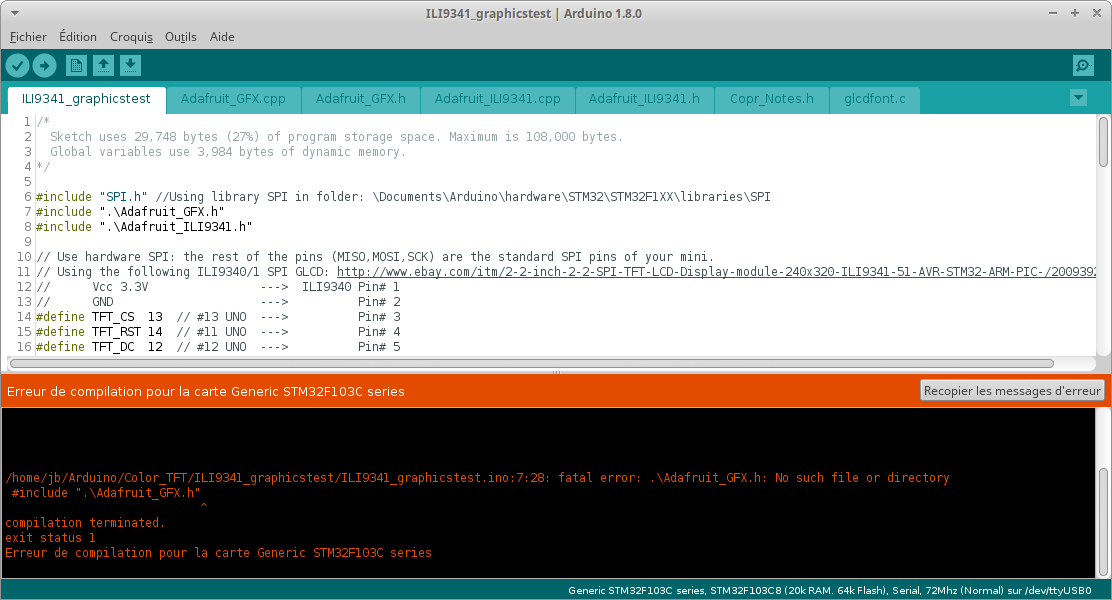 J'ai fais l’acquisition d'un stm32f103c8. J'ai trouvé un fichier pour commander un ecran ili9340. Je comprend pas qu'il ne trouve pas les bibliotheques comme on peux voir dans la capture d'écran.