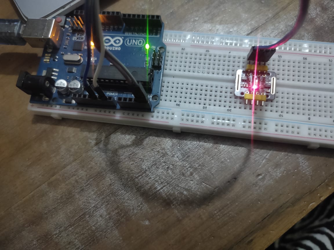 here is the photo of how I have wired the components. I used 3.3V before but when I changed it to 5V, the sensor light turned on for some time and it shows the wave form on serial plotter and values on serial monitor. But when I placed my finger on the sensor the light turned off and shows nothing. After that I removed the usb connection of arduno uno to my laptop and retried but there is no difference. I shows the same output as before