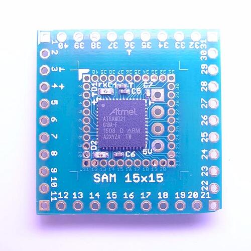 For hobbyists, the drawback of the SAMD21 is that it is only available in SMD. When blown up, it is pretty tough to replace it because no IC socket can be used. This can be solved with the SAM 15×15 board, which transforms the SAMD21G into a pin version: