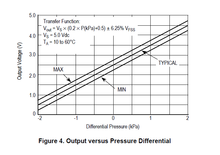 As to the 7 kPa about all I can figure is that if I apply a vacuum of 2 kPs to P2 (Port 2) that will give me an output of about 0.5 volt with Vcc = 5 volts. Now if I apply 4 kPa to P1 ( port 1) my output voltage will go to 4.5 volts and I can't really say -2 + 4 = 6 can I. They make it sound like I can apply a vacuum of -2.5 and get down to zero volts out and then apply 2.5 kPa and end up with 7?
